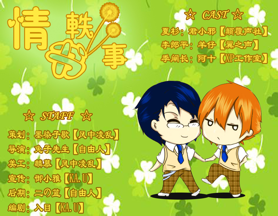 情书轶事 Staff: 策划:墨染子歇【风中凌乱】@_墨染子歇_帝隽_ 编剧:入目【KA.U】@_墨染子歇_帝隽_ 导演:兔子先生【自由人】@菊寶寶_兔子先生 美工:麟慕【风中凌乱】 宣传:御小雅【KA.U】 后期:二の蓝【自由人】@二蓝肿么可能辣么二QAQ Cast: 夏杉:君小邪【颠覆声社】@君小邪_Aries 李郎平:羊仔【翼之声】@夏日的羊屁屁 季阐长:阿十【XP工作室】@阿十-已然发奋图强