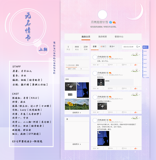 《无名情书》下期SC STAFF 原著:牙半仙儿 策导:开水【彩云水岸】 编剧:铜板【绘音配音】 后期:徽不缚【葬渊工作组】 CAST 师雪:沫生 陈凌松:寻常【KA.U】 女同学:阿厉【KA.U】 报幕:迈小步【十四桥】 同学一:西决【绘音配音】 同学二:叶玄澈【水岸聆音】 同学三:乱月Tsuki 班长:叶轩然 同学四:妤长安 同学五:半鬼【凡音织梦】 李春明:锋扬【白夜歌行】 王总:声声慢【有点贰工作室】 陆总:疯狗【STF剧团】 妈妈:Lucy【优思铭想】 ED《天造地设》—胖胖胖